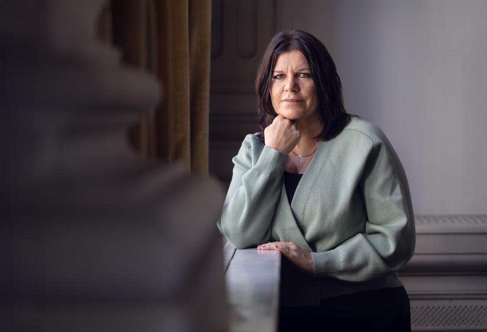 På bilden syns en medelålders kvinna vid namn Anna Häggblom som drar kurser i AI. HOn har lockigt axellångt rött hår, tittar rakt in i kameran och skrattar stort. Hon är klädd i en mörkgrön och vit skjortsblus och står med ena handen på höften. I bakgrunden ser man dels ett fönster med växter utanför, dels en mörk vägg där man blurrad kan skymta en tavla i rött och gult.